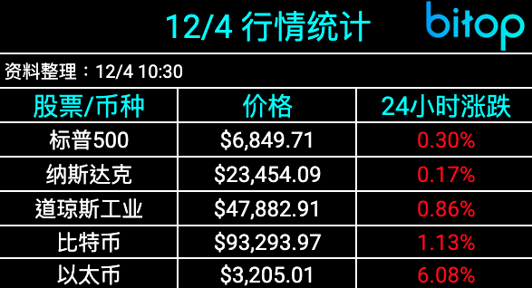 美股三大指数昨日(12/3)收高,ADP最新就业数据增强了投资人对美联储下周降息的信心。 加密总体市值上涨2.57%,比特币(BTC)今晨一度上涨至94,150美元,带动整体市场上扬,以太币(ETH)24小时上涨6.08%,截稿前报在3,205美元。市场恐慌情绪已略为缓解,随着美联储于12/1停止量化紧缩,比特币与标普500指数的相关性再度升高。