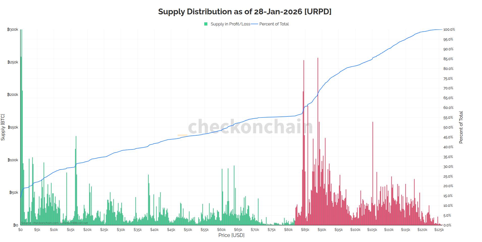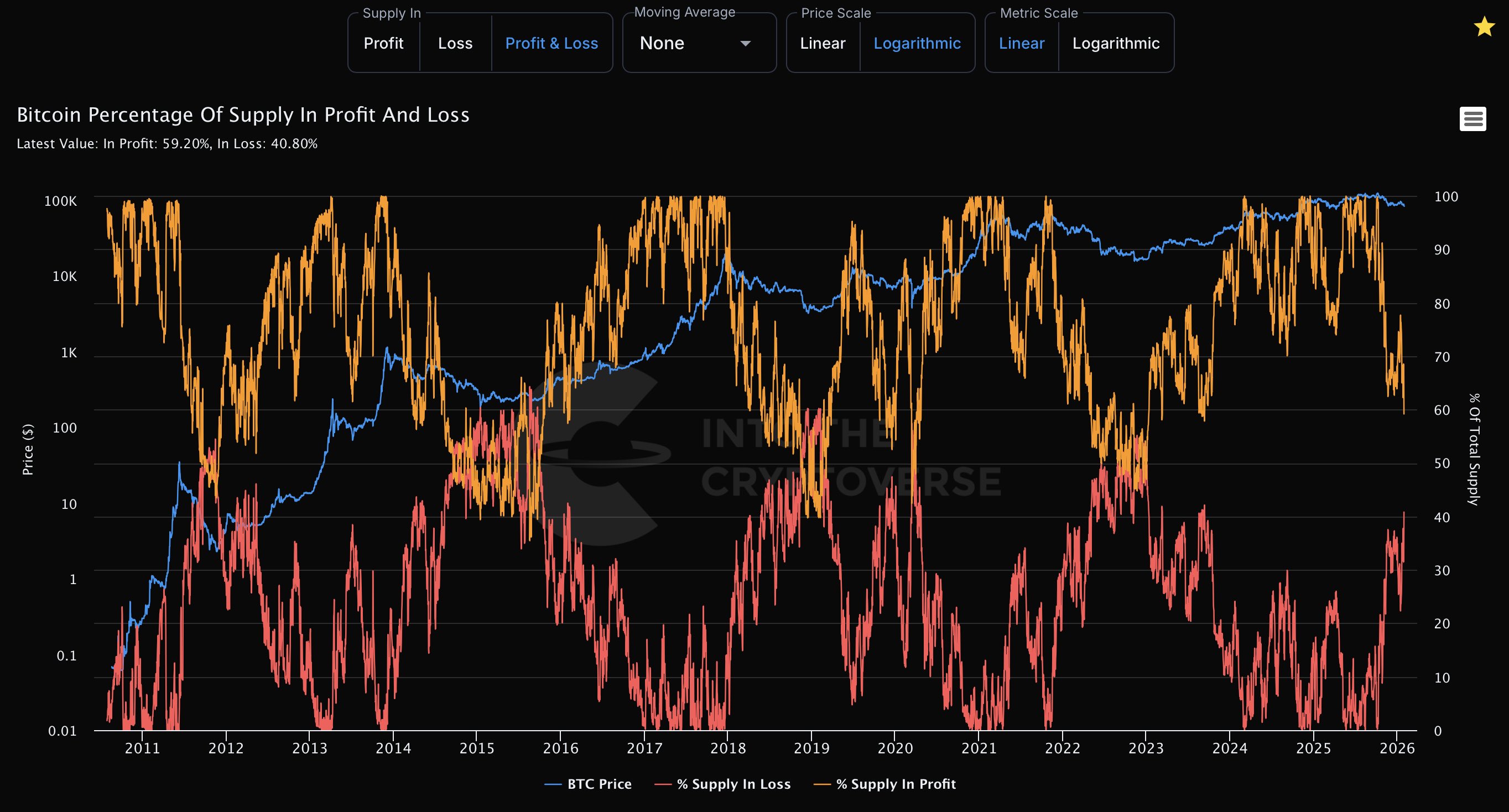 Red line: Percentage of Bitcoin supply in loss
